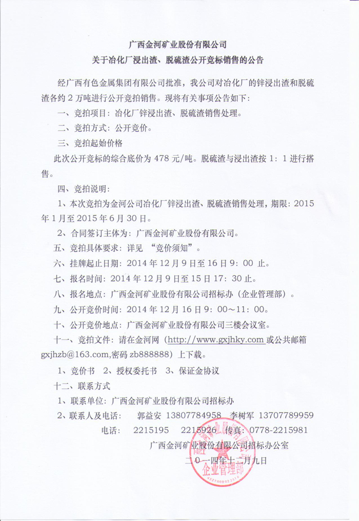 廣西金河礦業股份有限公司關于冶化廠浸出渣、脫硫渣公開競標銷售的公告 |