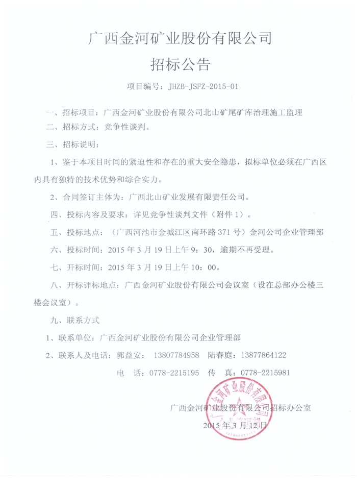 廣西金河礦業股份有限公司北山礦尾礦庫治理施工監理招標公告 |