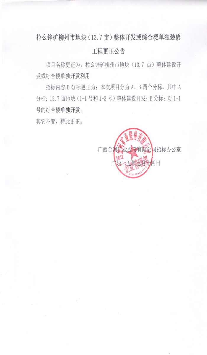 廣西金河礦業(yè)股份有限公司拉么鋅礦柳州市地塊(13.7畝)整體開(kāi)發(fā)或綜合樓單獨(dú)裝修工程更正公告