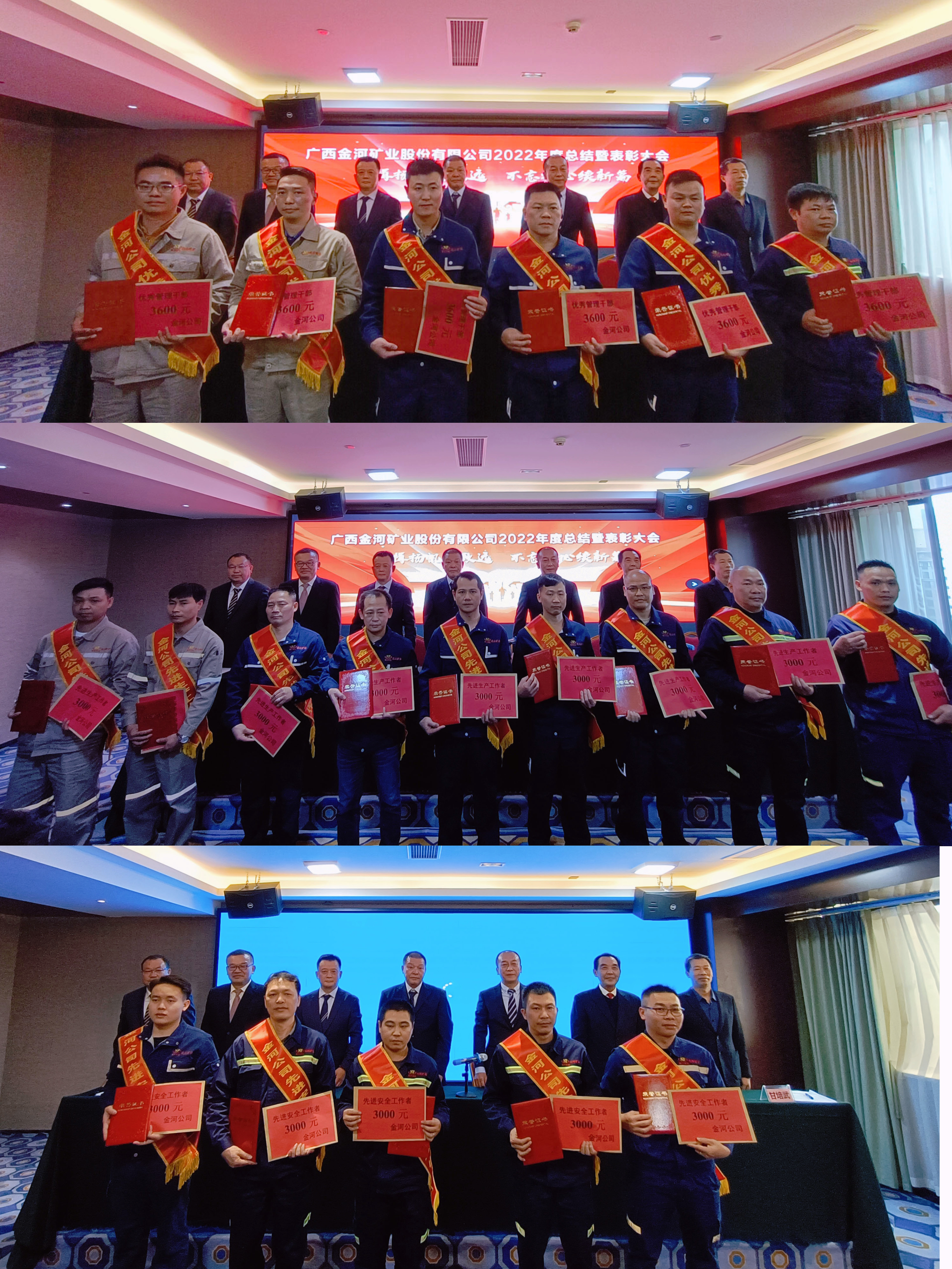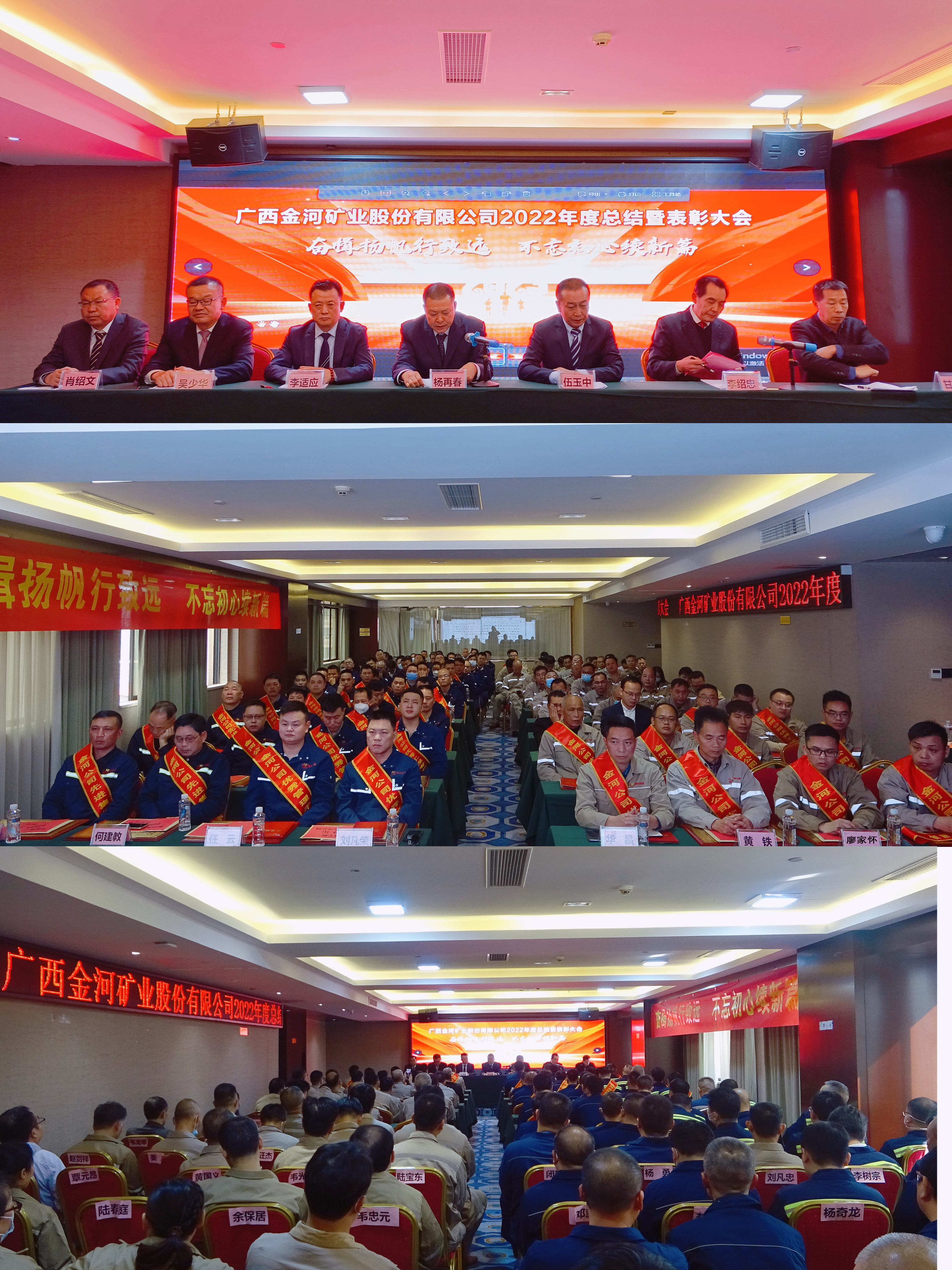 2023年1月14日下午三點整,廣西金河礦業股份有限公司2022年度總結暨表彰大會在金城江金廣國際大酒店12樓會議廳隆重召開,金河公司董事會成員、監事會成員、股東代表、經營班子、下屬三個礦山副科級以上管理人員、機關各單位管理人及各單位先進、優秀代表等130余人參加會議。金河公司黨委書記李紹忠主持會議。