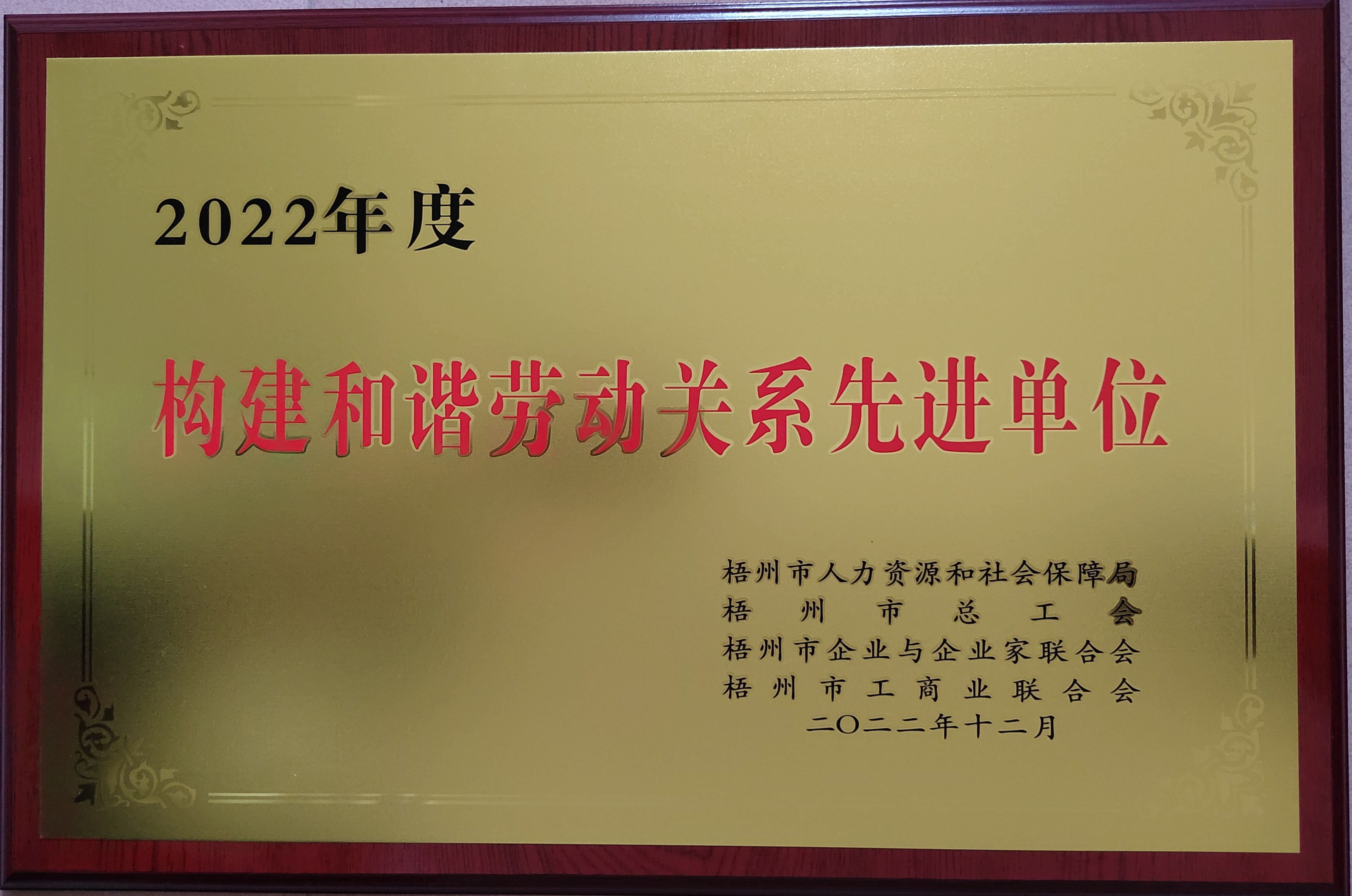 龍灣公司榮獲“2022年度梧州市構建和諧 勞動關系”先進單位榮譽稱號